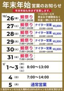 年末年始も休まず営業します。ご予約は早めにお願いします。